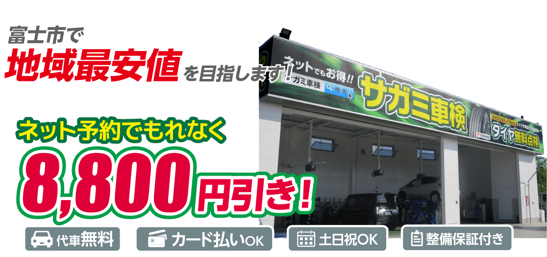 サガミ車検センター富士はカーディーラーや車検専門店と車検時の点検・整備内容が同じですが、トータルの車検料金を比べると他社より割安です。なぜなら折込チラシ等の宣伝広告を行っていないから。その分車検料金を安くしてお客様に還元させていただいております。